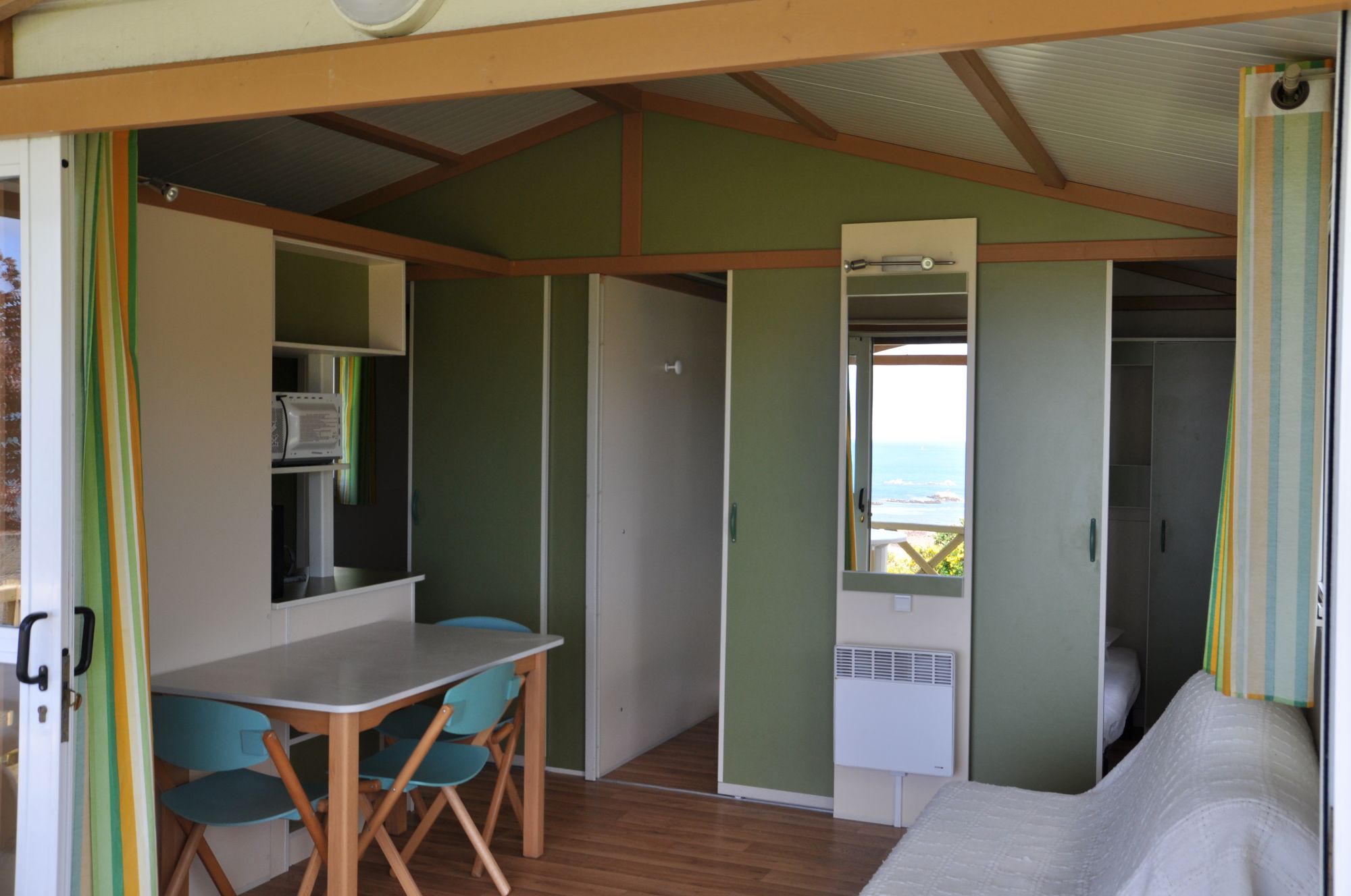 - 2 chambres : Une avec un lit double (140 x 190) et la seconde avec 2 lits simples superposés (90 x 190)